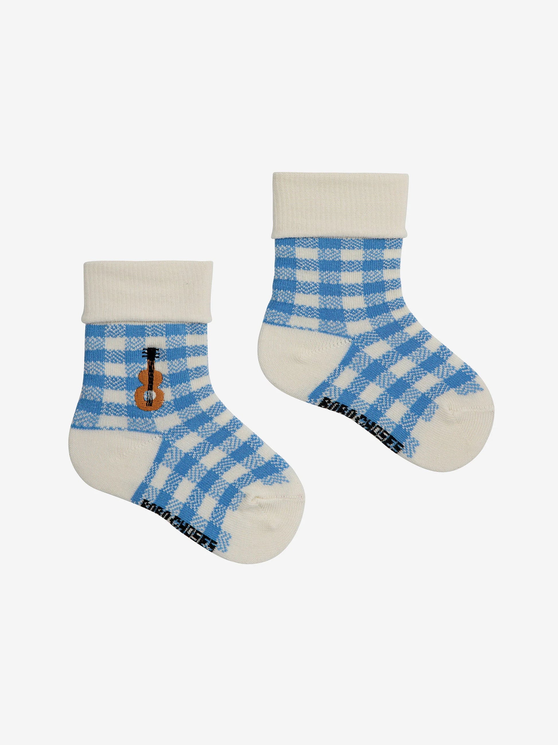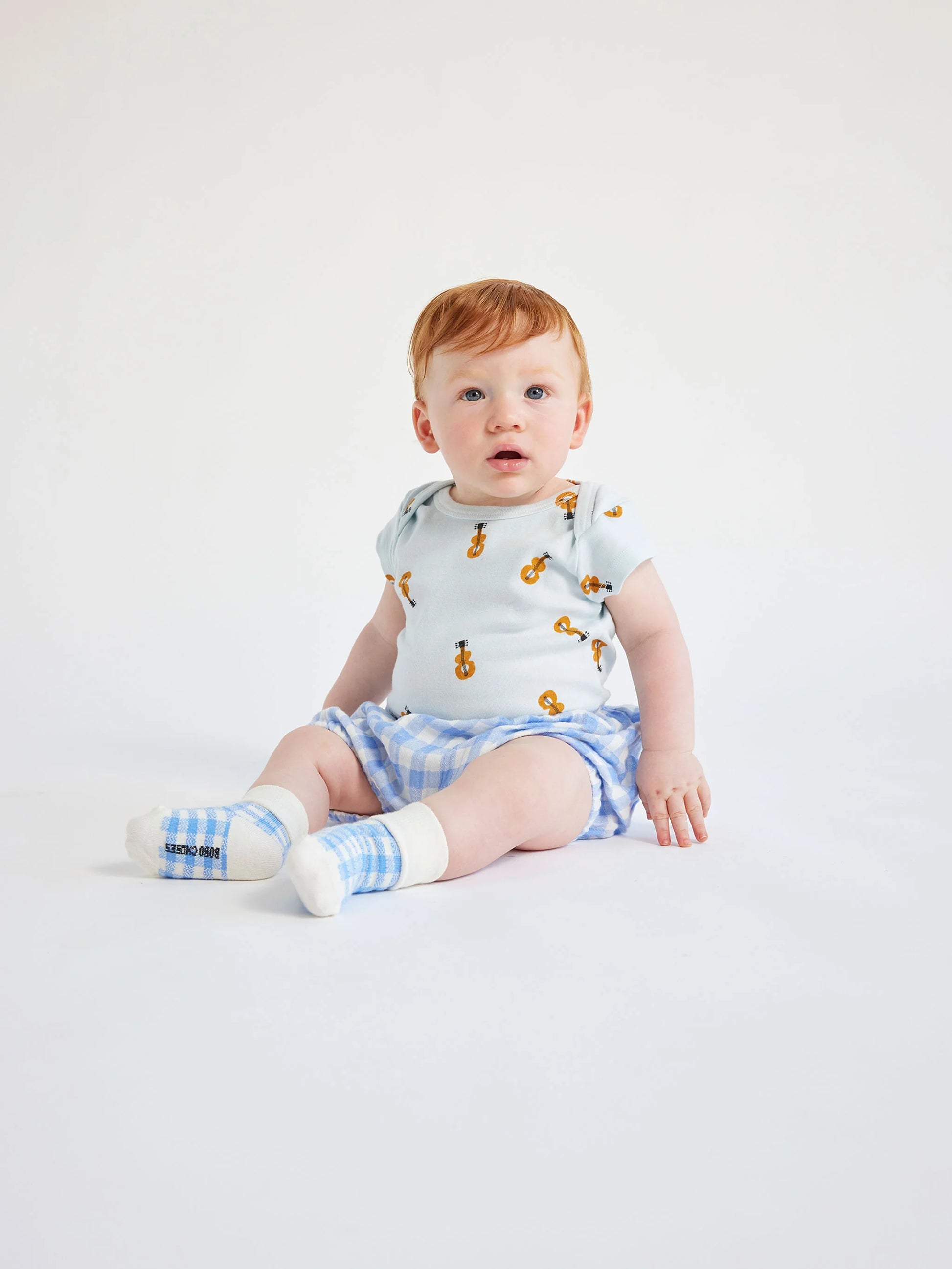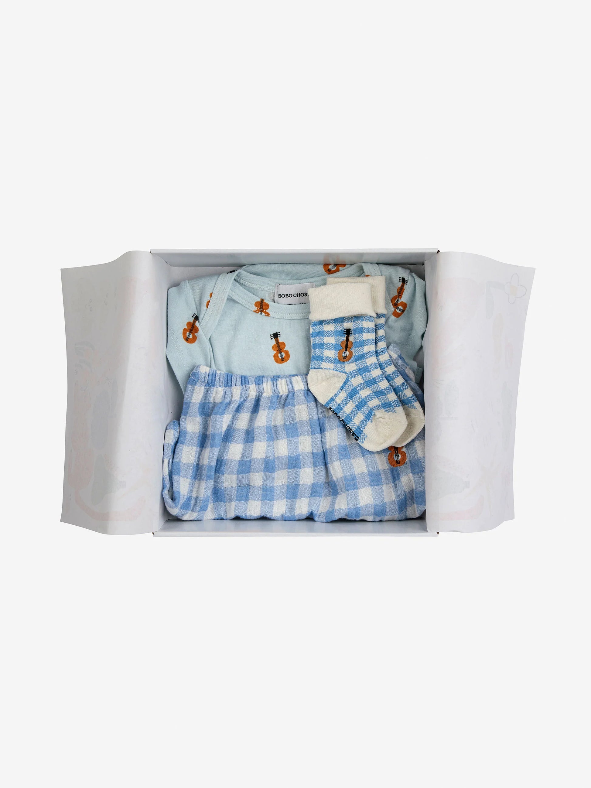 Dreiteiliges Geschenkset, bestehend aus einem weichen, blauen Baumwoll-Strampler mit Gitarren-Allover-Aufdruck, hellblauen Gingham-Shorts mit aufgestickter Gitarre auf der linken Seite und passenden blauen Gingham-Socken.