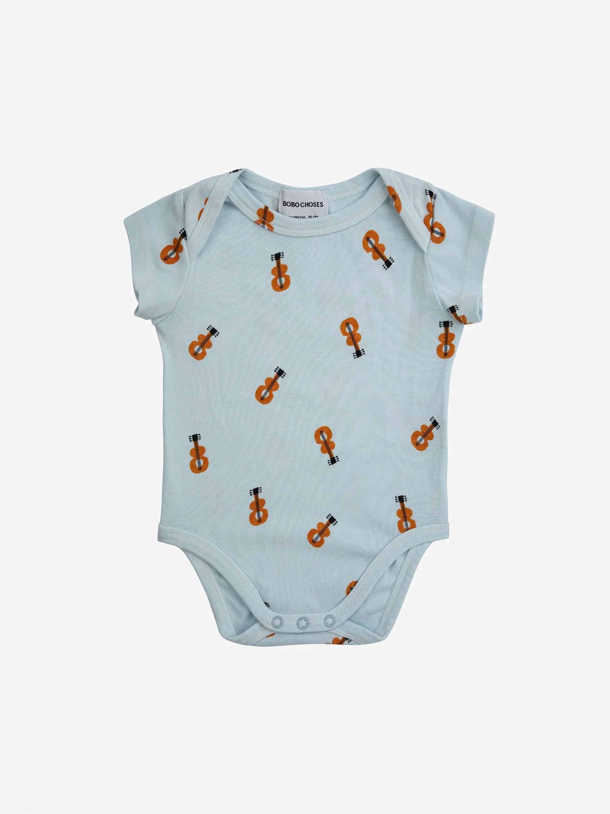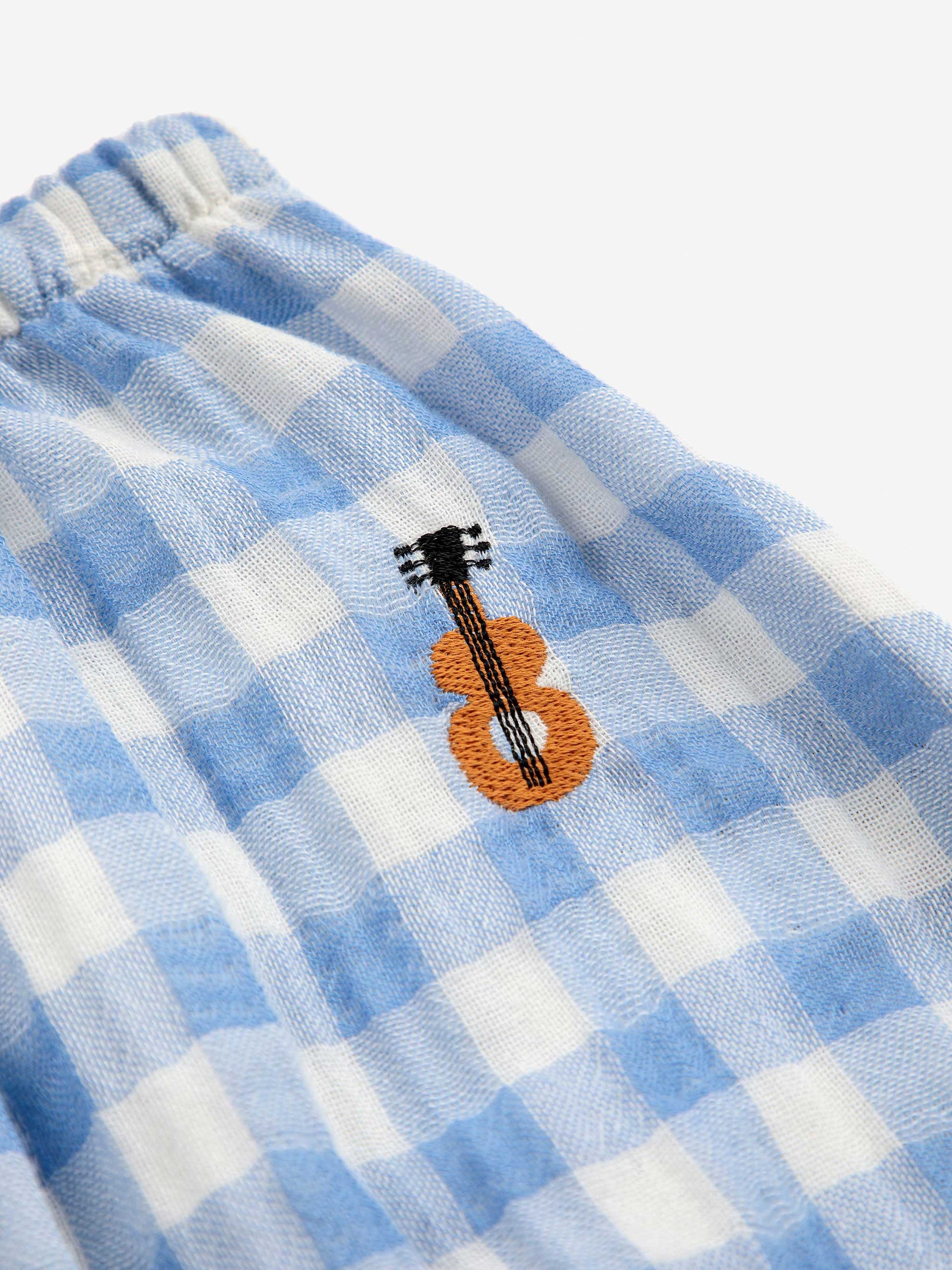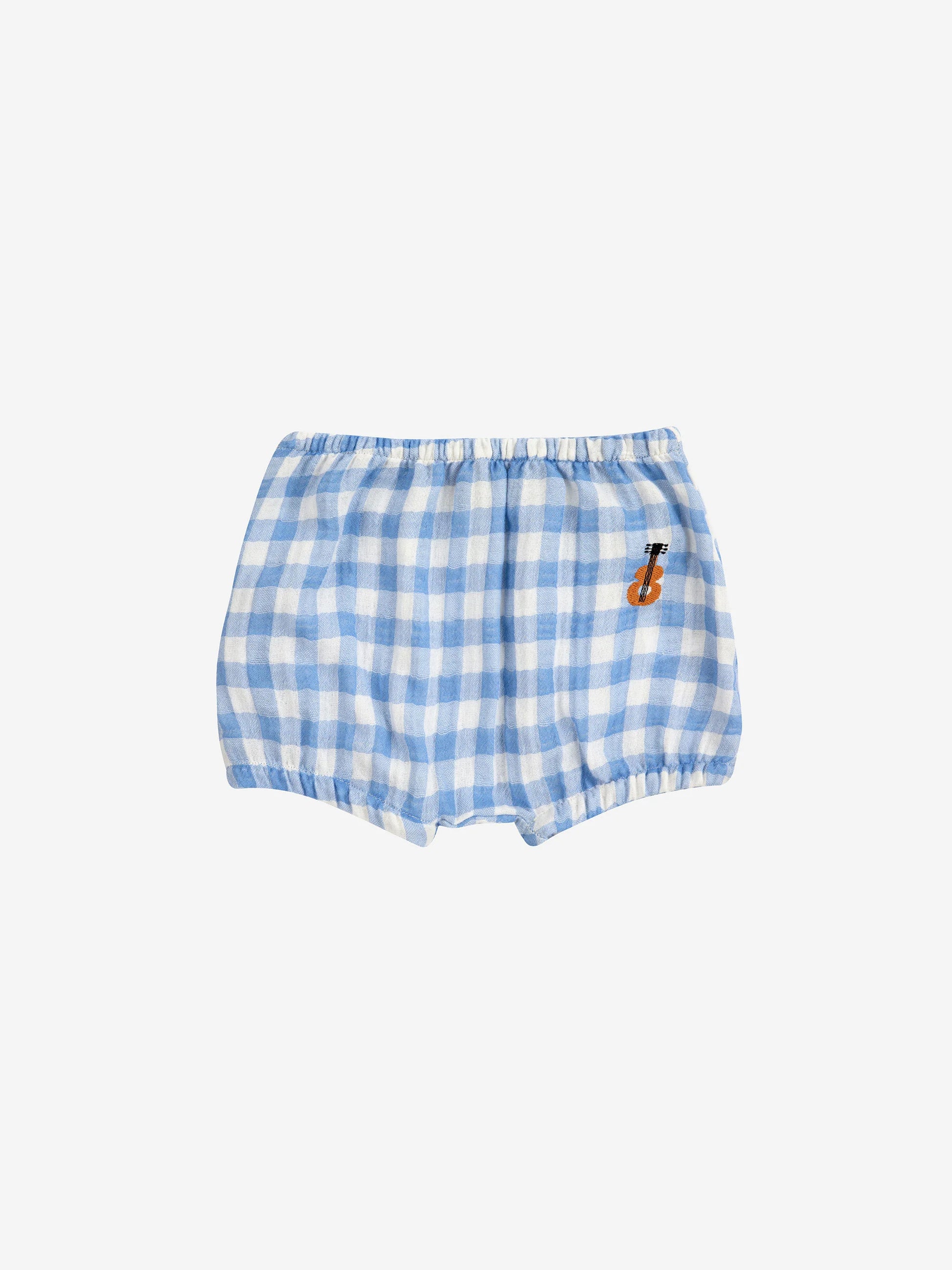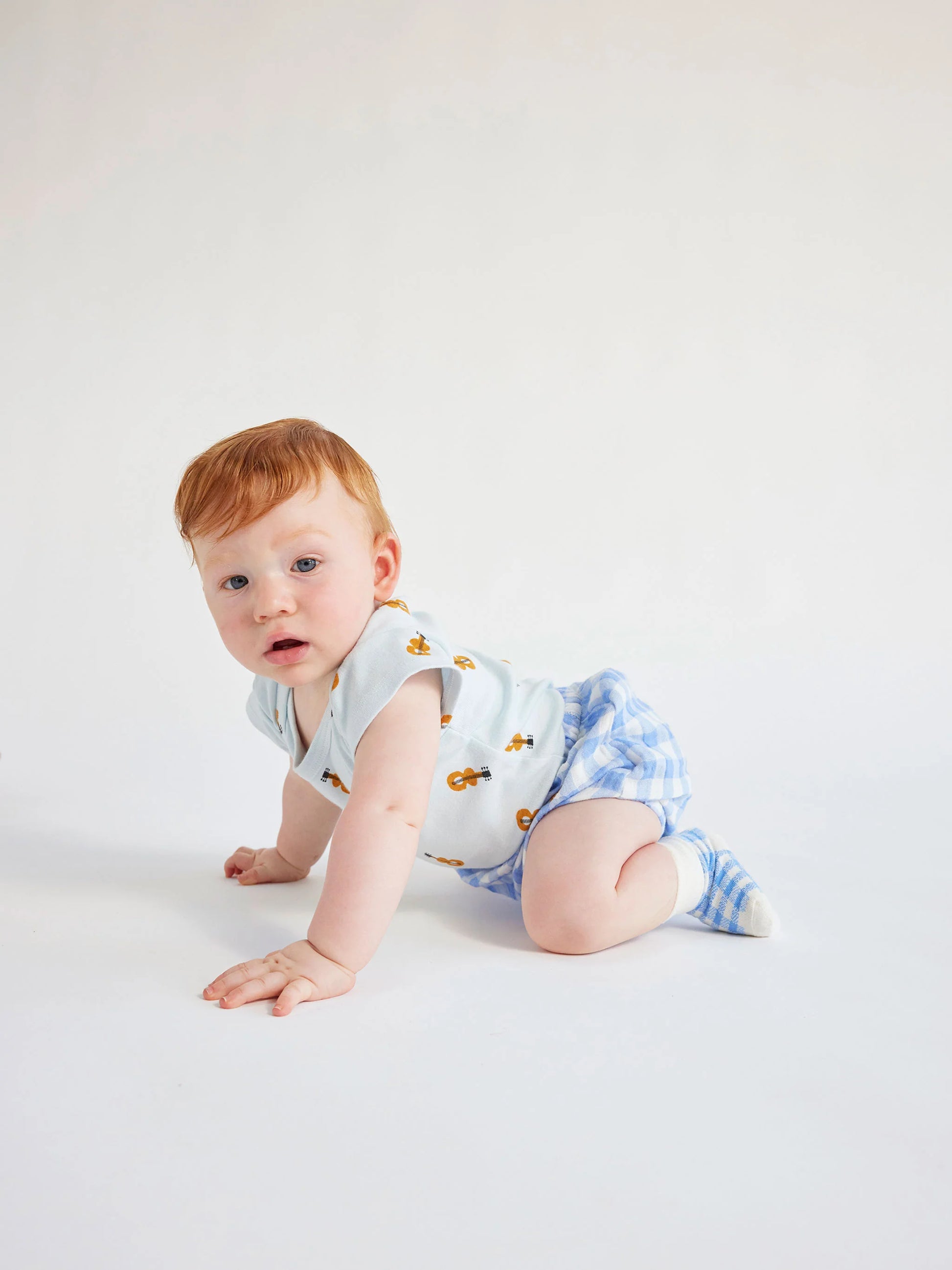 Dreiteiliges Geschenkset, bestehend aus einem weichen, blauen Baumwoll-Strampler mit Gitarren-Allover-Aufdruck, hellblauen Gingham-Shorts mit aufgestickter Gitarre auf der linken Seite und passenden blauen Gingham-Socken.