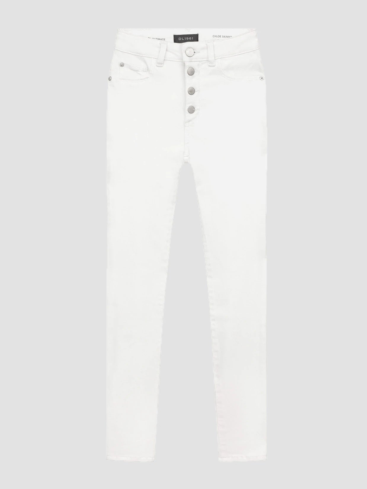 Weiß ist ein helles, undurchsichtiges Weiß mit sichtbaren Zierknöpfen, die einen versteckten Hosenschlitz mit Reißverschluss verdecken. Es verfügt über Ziertaschen vorne, farblich abgestimmte Nähte, mattsilberne Beschläge und einen sauberen Saum.