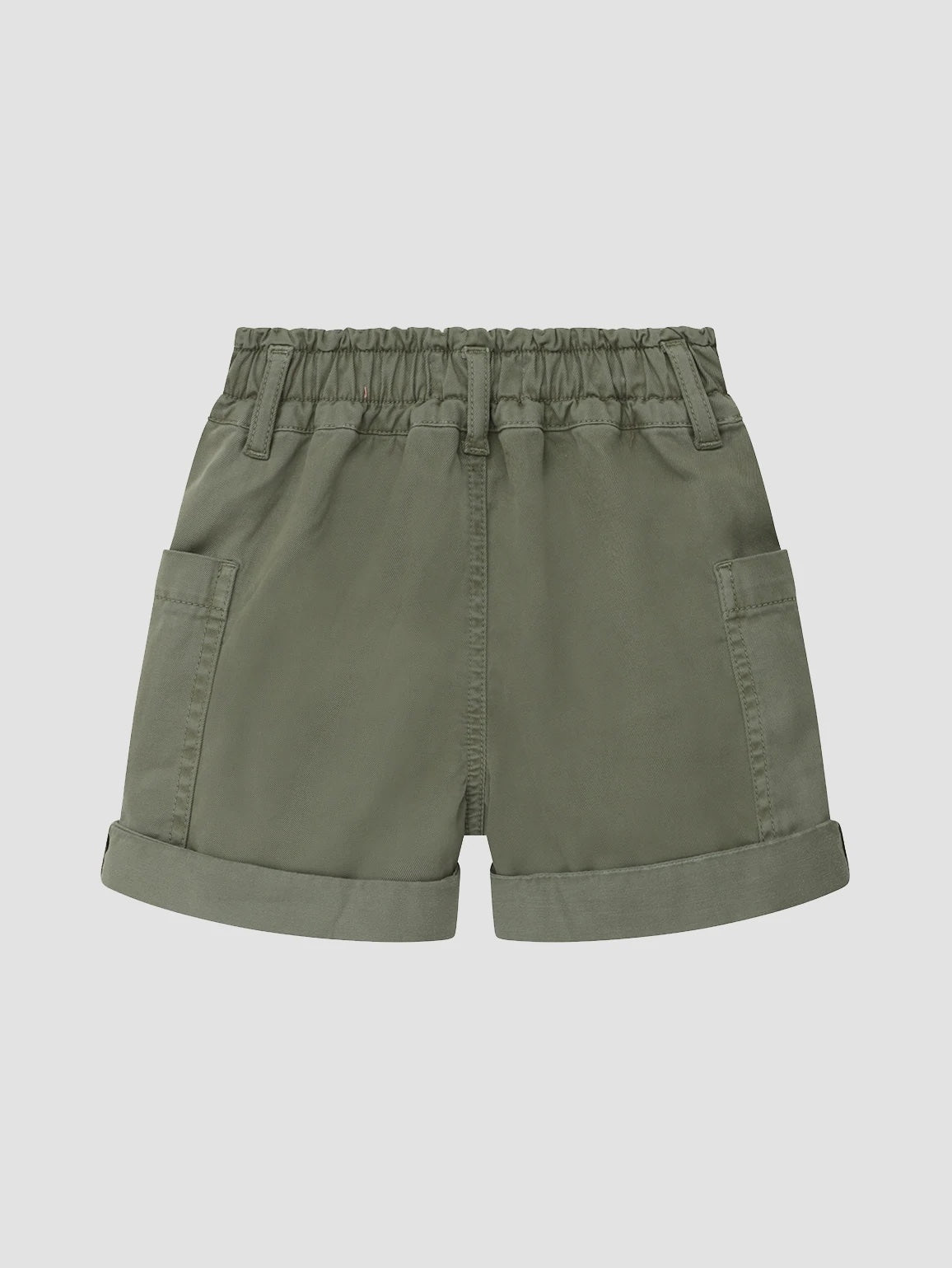 Light Army Twill ist ein gewaschener Salbei mit Paperbag-Taille und übergroßen, umlaufenden Seitentaschen. Es verfügt über farblich abgestimmte Nähte, gebürstete Goldbeschläge, einen Hosenschlitz mit Reißverschluss und einen gerollten Saum.