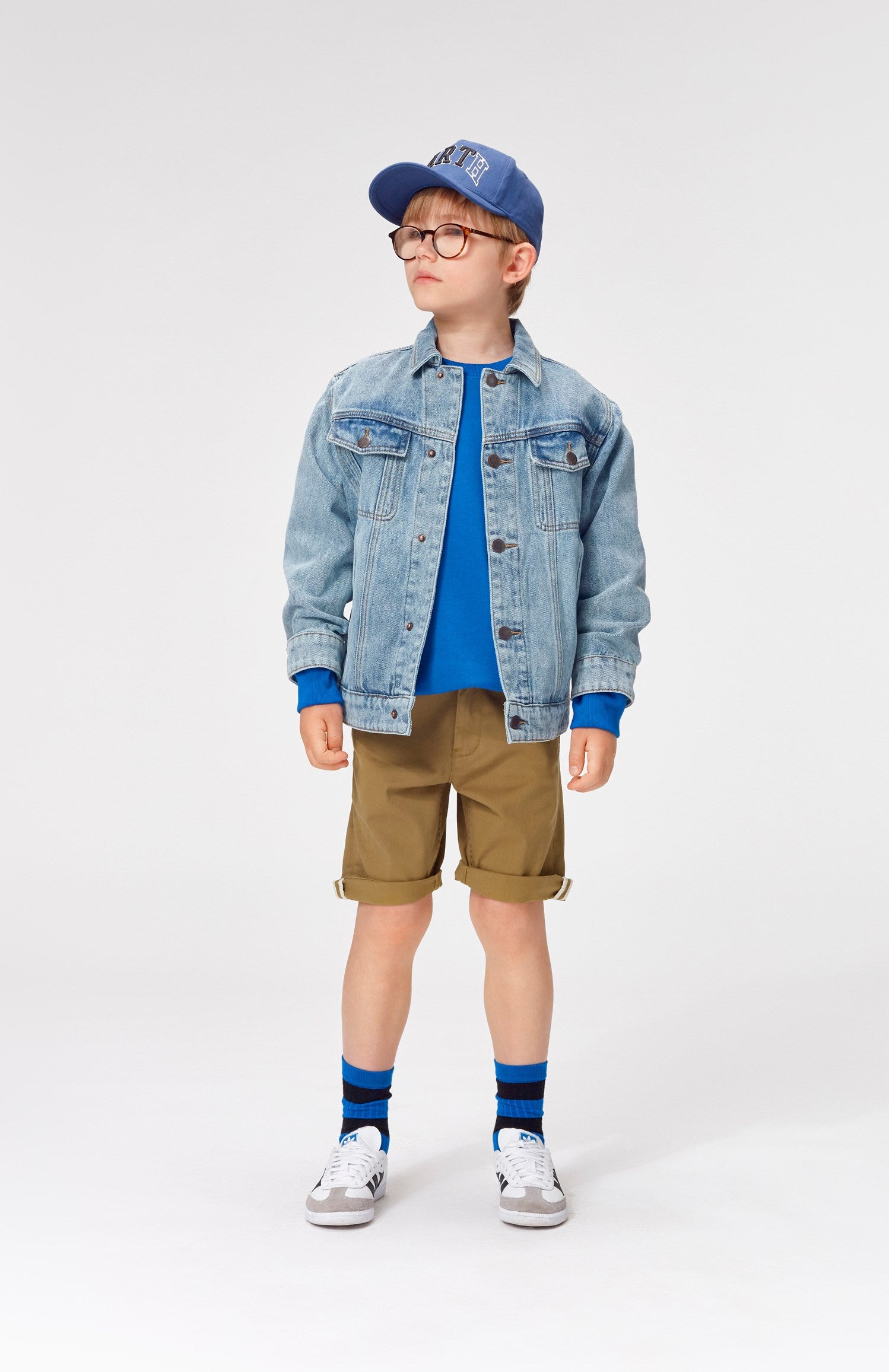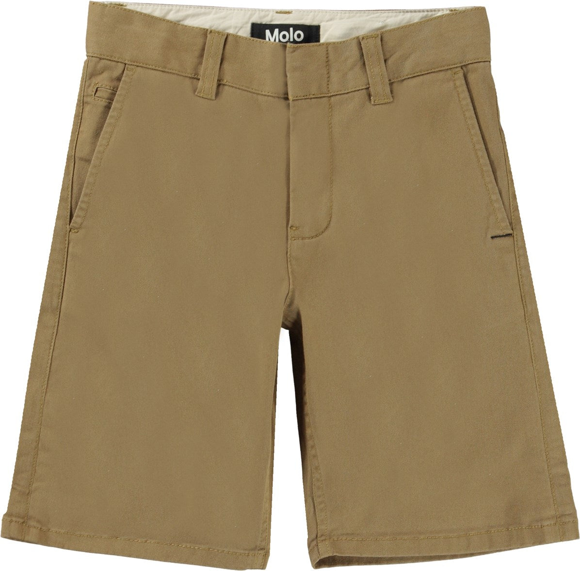 Alan ist eine eichenfarbene Chino-Shorts mit zwei Vordertaschen und einer Gesäßtasche. Über den Gesäßtaschen befindet sich ein schwarz-weißer Logo-Aufnäher.