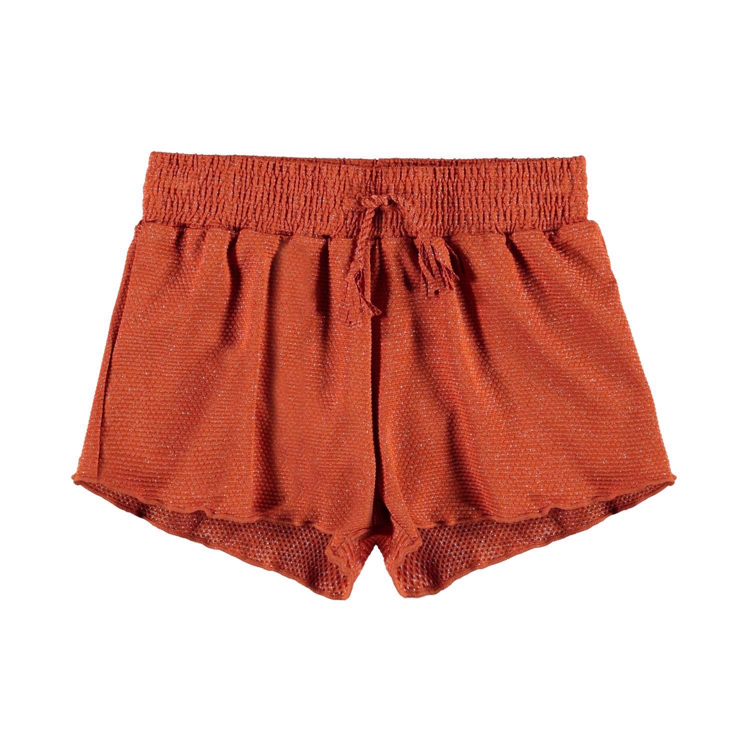 Nicci ist eine kurze Badehose in Rostrot mit einem schönen Goldfaden im Stoff. Nicci hat einen elastischen Bund mit Bändern. Tragen Sie die Hose mit einem passenden T-Shirt oder Bikini für einen coolen Surfer-Look.