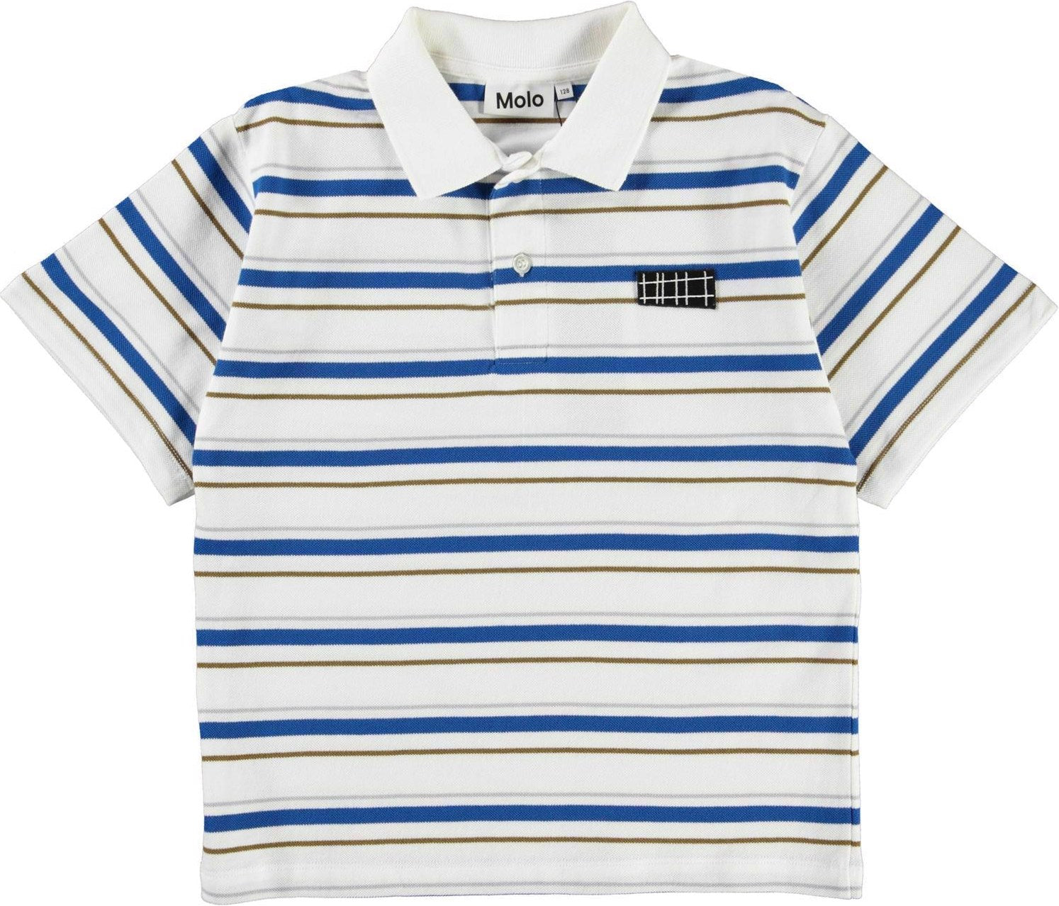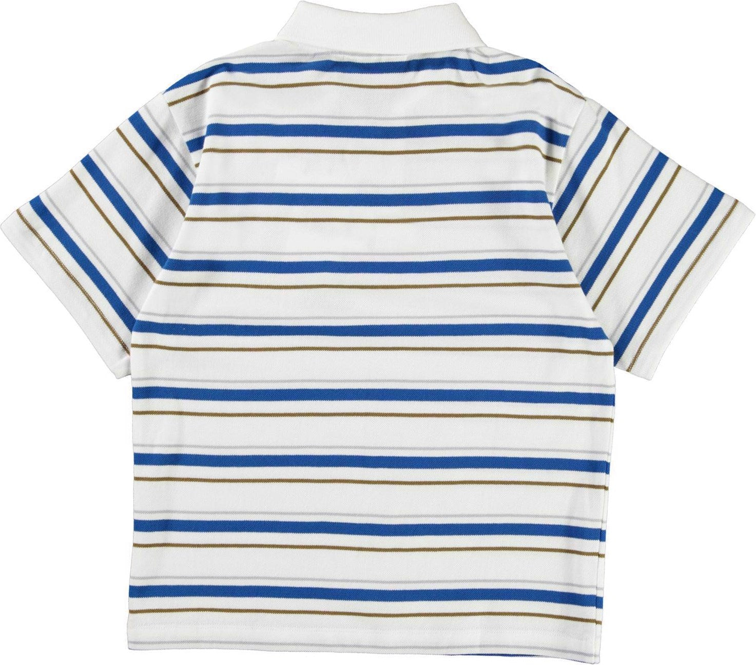 Rilloz ist ein weißes Polo-T-Shirt mit weißem Kragen und Streifen in Blau, Braun und Grau.