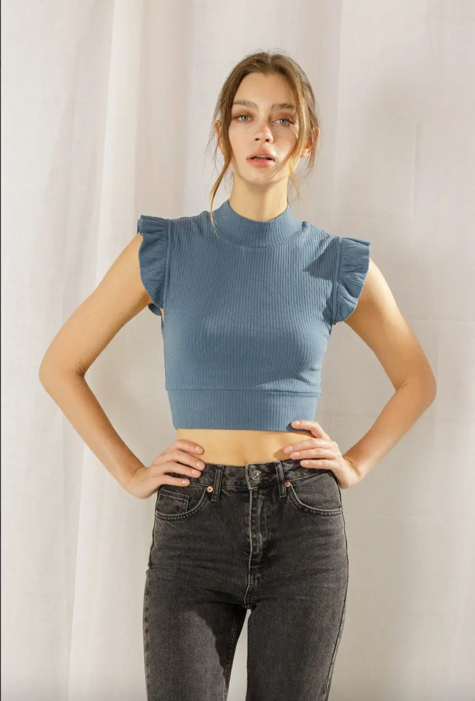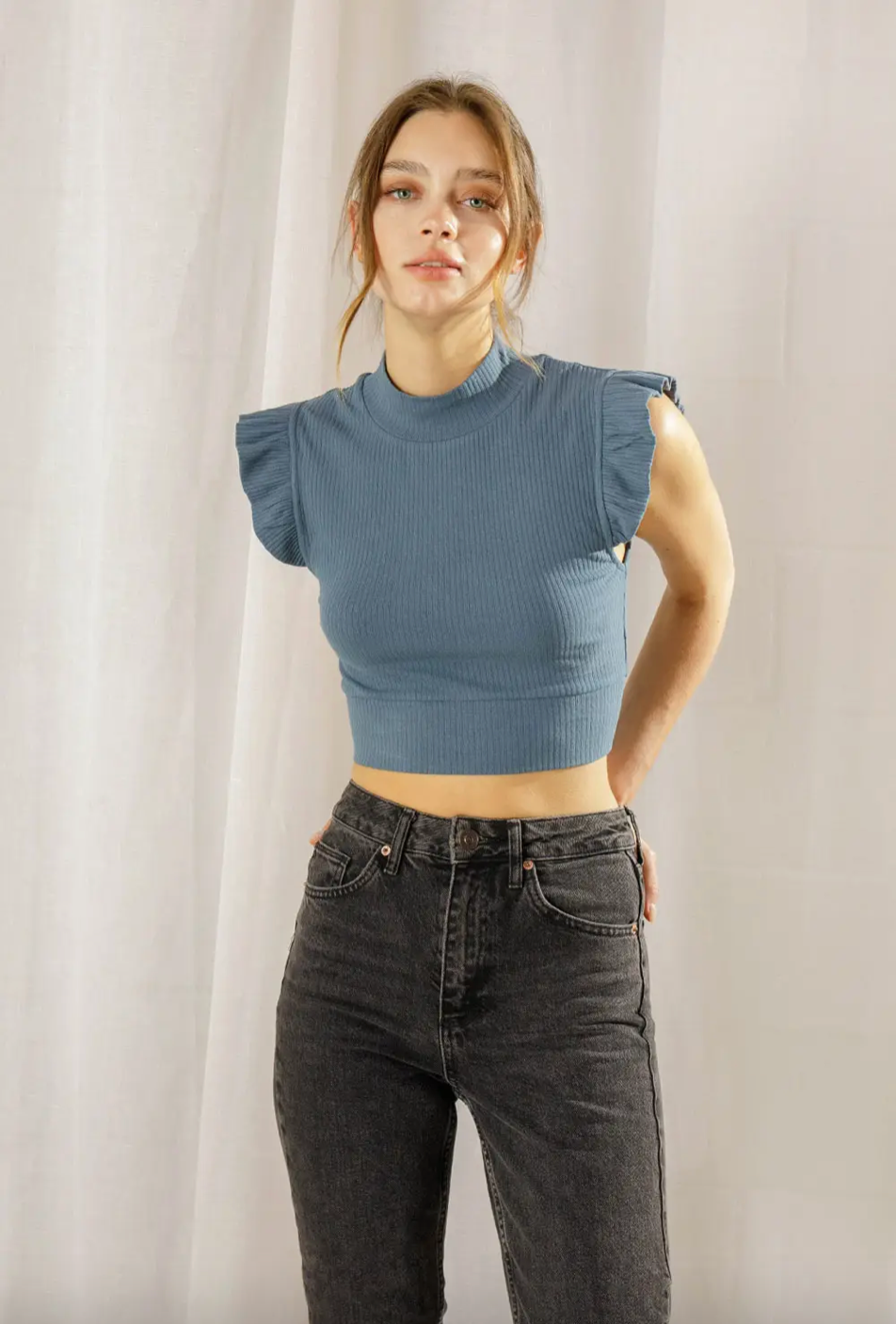 Perfekt zu Leggings mit hoher Taille oder als Ergänzung zu Ihrem Lieblingsrock für besondere Anlässe. Dieses ärmellose Oberteil mit gerippten Rüschenärmeln ist das perfekte „Teenager“-Basic für jedes Kleidungsstück in Ihrem Kleiderschrank.