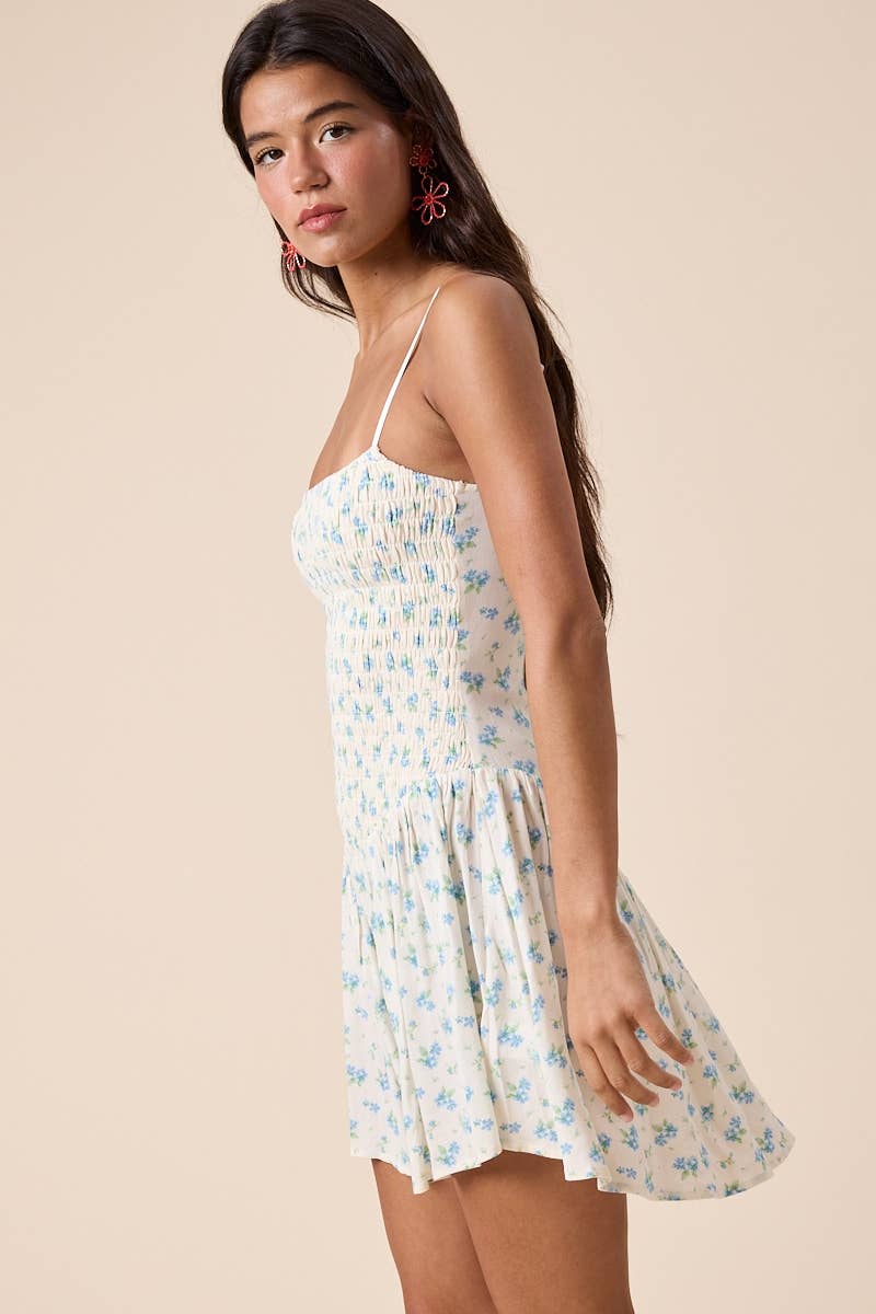 Meadow Muse Smocked Mini Dress – Ditsy Floral Square Neck for Juniors