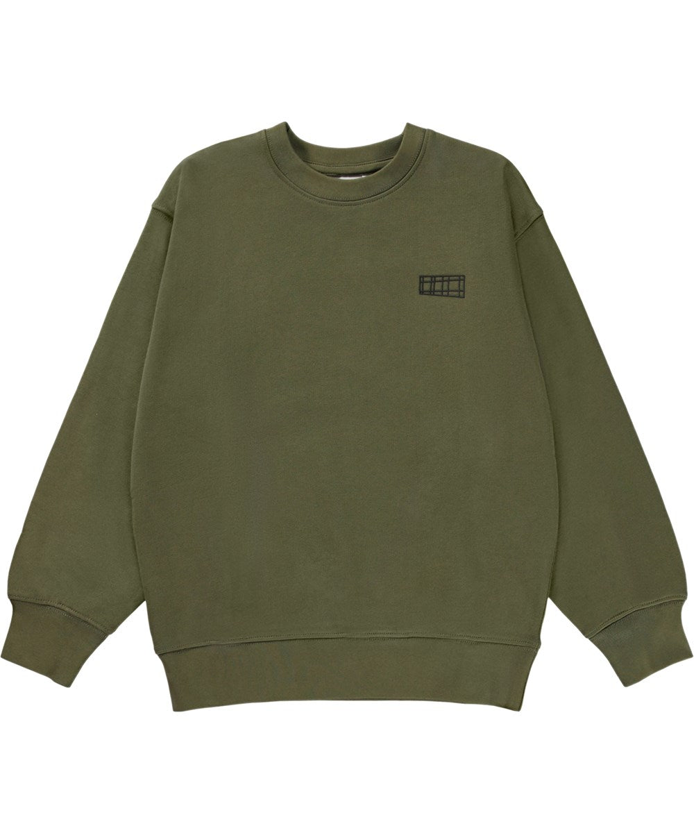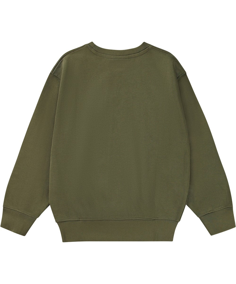 Army green sweatshirt with a black logo printed on the front. This sweatshirt is in 100% cotton, and it has a round neck with a rib edge and rib at the sleeves and bottom. It is in a regular fit.