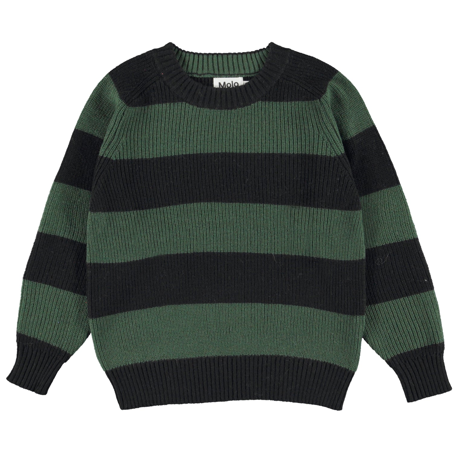 Bosse is a green and blue striped cotton knit top. The knit top has a rib at the neck, sleeves and bottom.