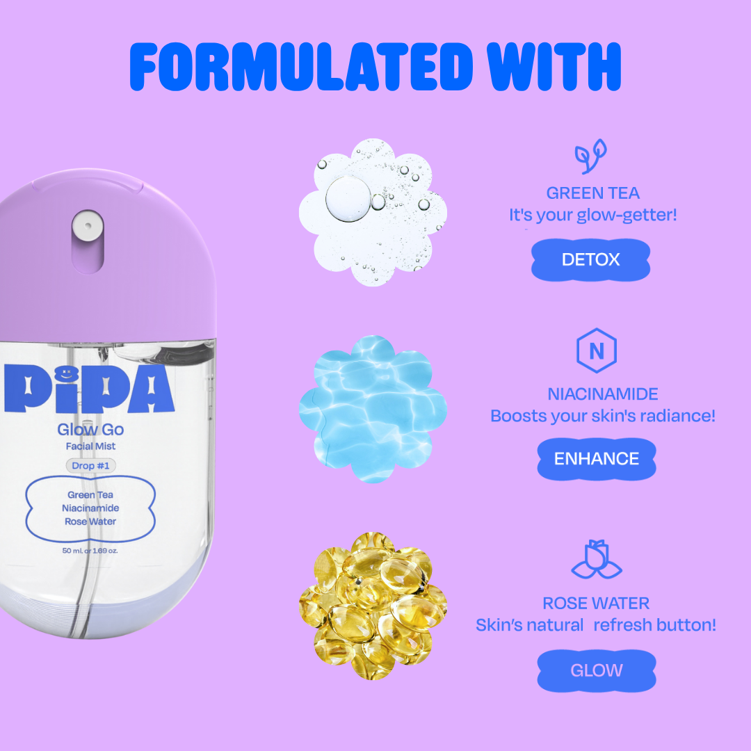 Pipa Skincare Glow Go Facial Mist delivers instant hydration and a healthy, dewy glow — made with science-backed, clean ingredients that are gentle enough for young skin. Infused with organic rose water, this refreshing face mist calms, hydrates, and revitalizes skin throughout the day.